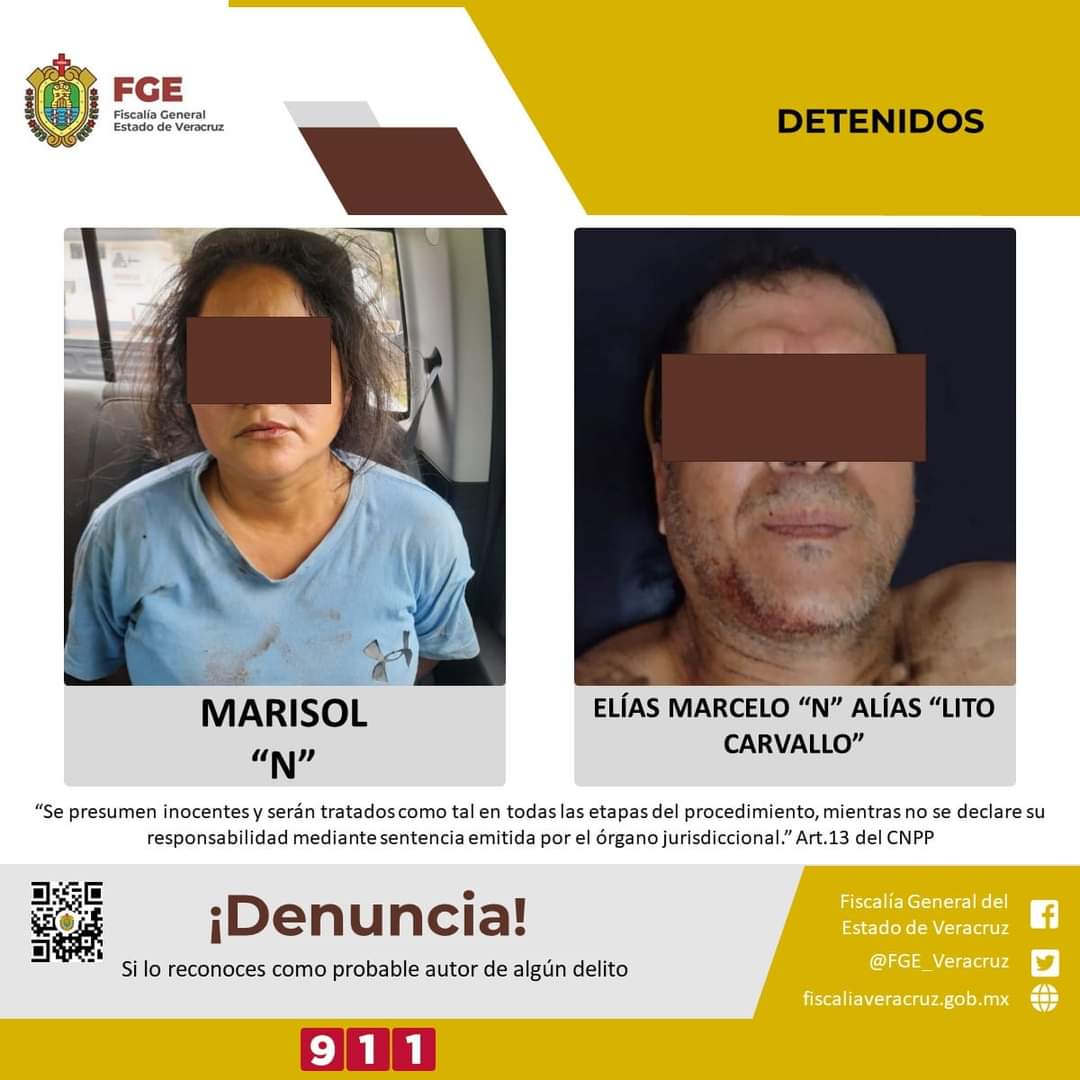 Xalapa, Ver., a 29 de junio de 2022.-La Fiscalía General del Estado informa, que elementos de la Policía Ministerial, en la comunidad El Tibernal, del municipio de Santiago Tuxtla, cumplimentaron orden de aprehensión en contra de Elías Marcelo “N”, alias “Lito Carvallo” por el presunto delito de abigeato quien se encontraba en compañía de su esposa Marisol “N”, la cual también fue detenida ya que al momento de proceder al cumplimiento del mandato judicial, ambos agredieron a los elementos policiacos con arma de fuego.