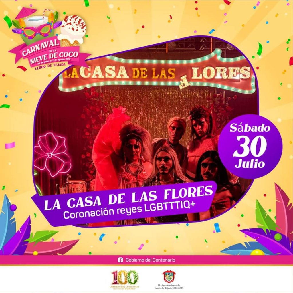7:00 pm Desfile de lo Reyes LGBTIQ+, 9:00 pm Coronación de los Reyes, bajo la conducción de la Tía Justa, amenizado por el espectáculo de la Casa de Las Flores.