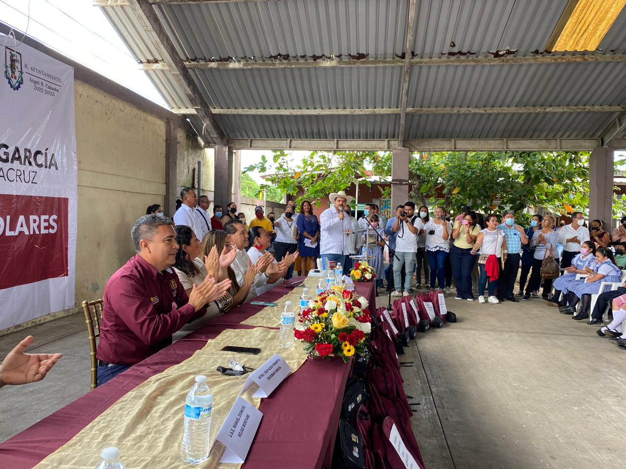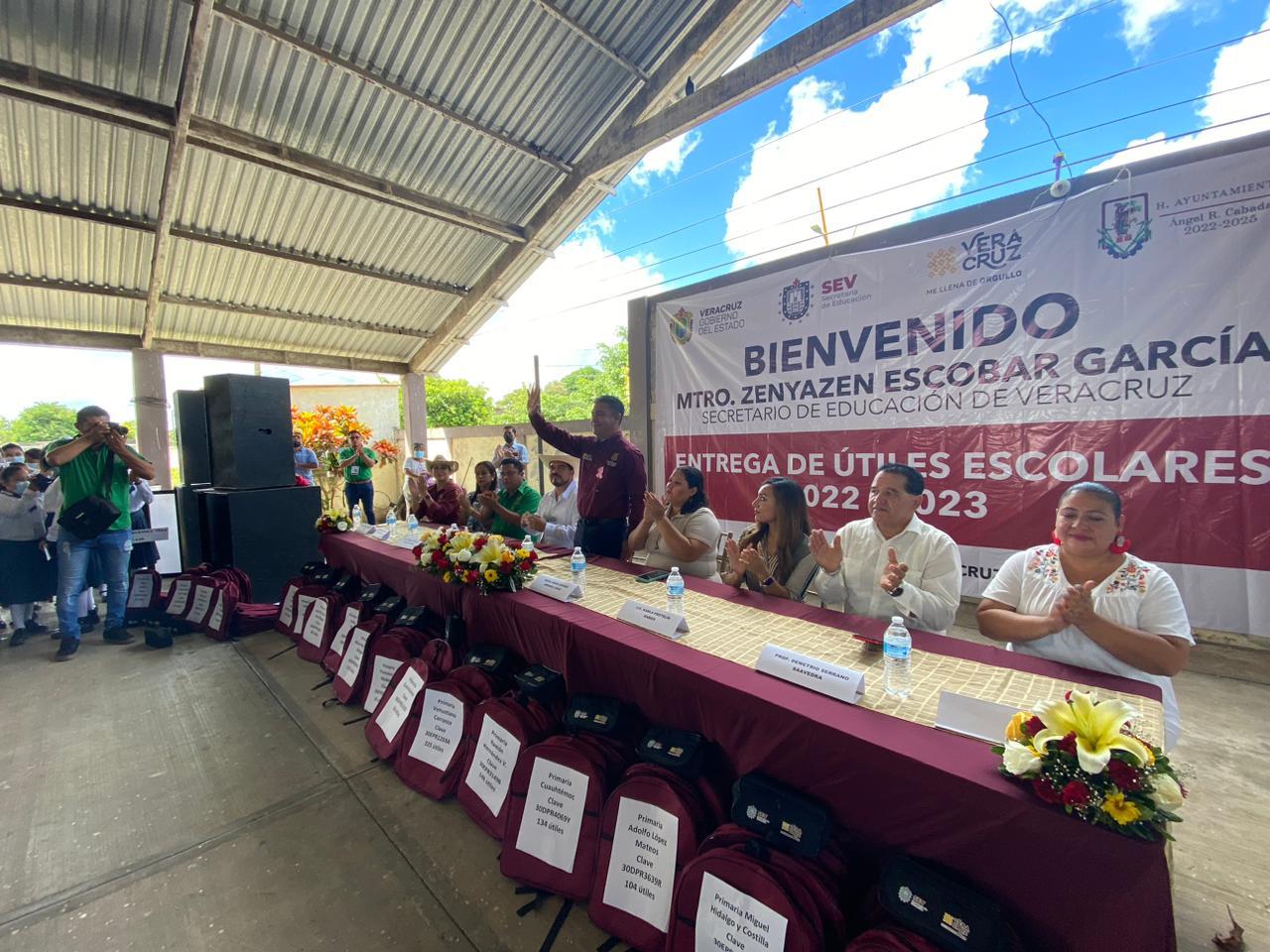 Este día el Presidente Municipal Julio César García Machucho junto al Secretario de Educación de Veracruz, Zenyazen Escobar García, hizo entrega de paquetes de útiles escolares, kits para maestros, y kits de limpieza.